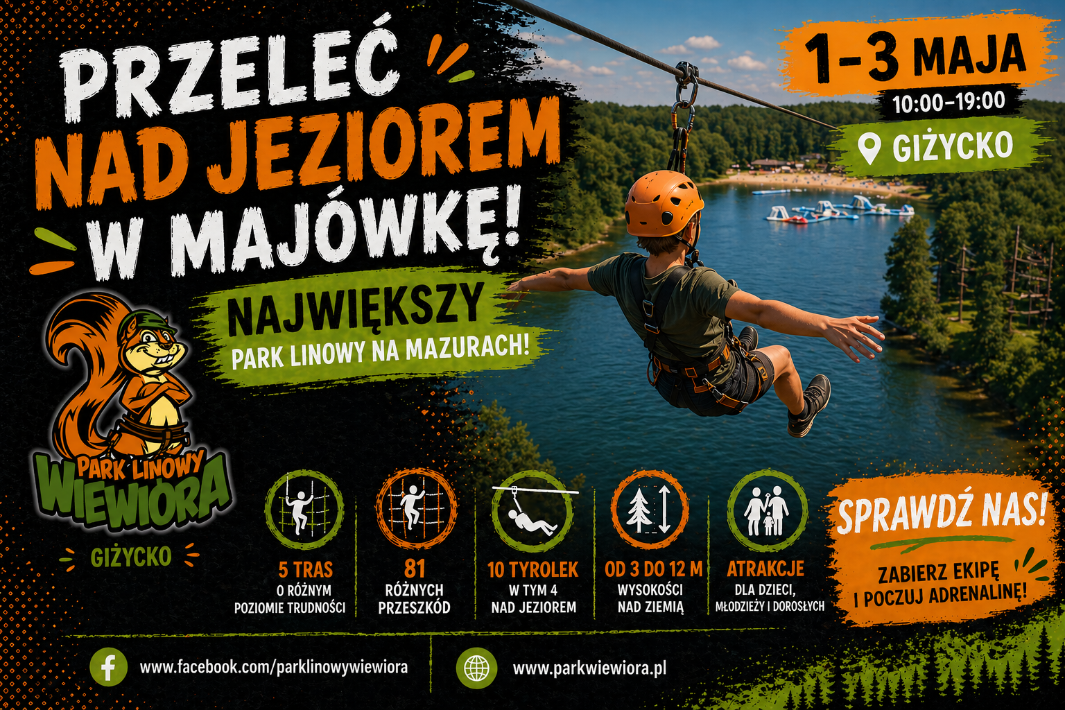 Park Linowy Wiewióra jest jedną z głównych atrakcji w Giżycku – w przepięknej stolicy mazurskich jezior. Oferuje możliwość aktywnego spędzenia czasu dla całych rodzin, grup zorganizowanych, pojedynczych gości w różnym przedziale wiekowym. Park zlokalizowany jest w malowniczym w lesie nad jeziorem popówka mała, nieopodal znajduje się również warta zobaczenia Twierdza Boyen. Nasz Park jest największym tego typu obiektem na Mazurach i z pewnością wyróżnia się również z pośród innych Parków w całej Polsce. Wyjątkowymi atrakcjami są z pewnością 4 przejazdy linowe (tyrolki) nad jeziorem, oraz unikatowy wielki basen z 10tyś piłeczek. Zapraszamy serdecznie do wspólnej bezpiecznej zabawy na wysokości!